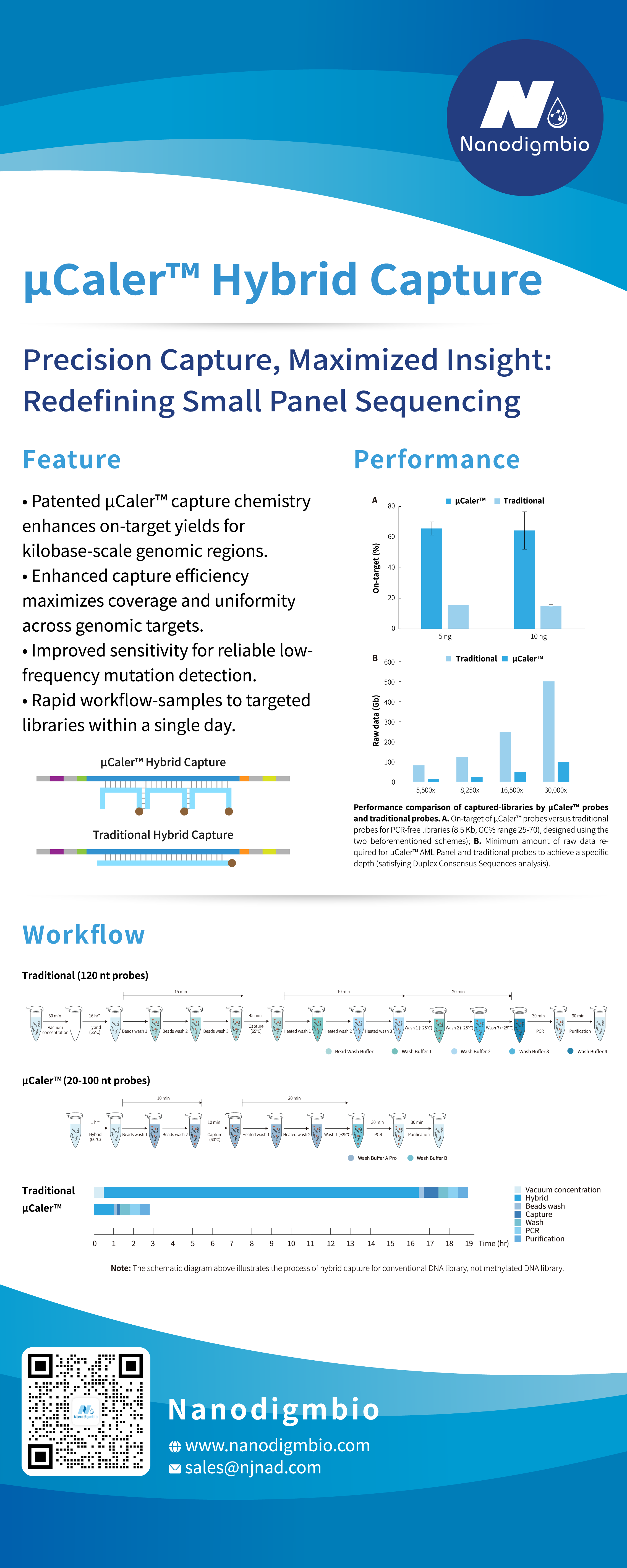 μCaler Hybrid System is a liquid phase hybridization capture system optimized for the targeted enrichment of small panels. μCaler NanoBlockers and μCaler Panel based on innovative scheme constitute a complete liquid phase hybridization capture system. Complete the entire process of capture library construction in a single day. μCaler Panel is a commercialized or customized Panel based on the innovative design of Nanodigmbio's independent intellectual property rights, which can quickly find the binding position in the reaction system, and further stabilize after multiple probes are combined with the target area. With this system, Nanodigmbio has launched μCaler DNA Full Screen System Comprehensive Solution and two sets of NGS-MRD solutions, namely: μCaler MRD Solution (Tumor-informed Assay) and μCaler AML MRD Comprehensive Solution (Tumor-uninformed Assay), It can also be applied to the detection of common cancer HotSpot mutation areas (μCaler HotSpot Panel), methylation detection (μCaler EMS Panel), pathogen microbial detection, multiple cancer methylation detection with FS system (μCaler FS EMS+ Panel), etc.