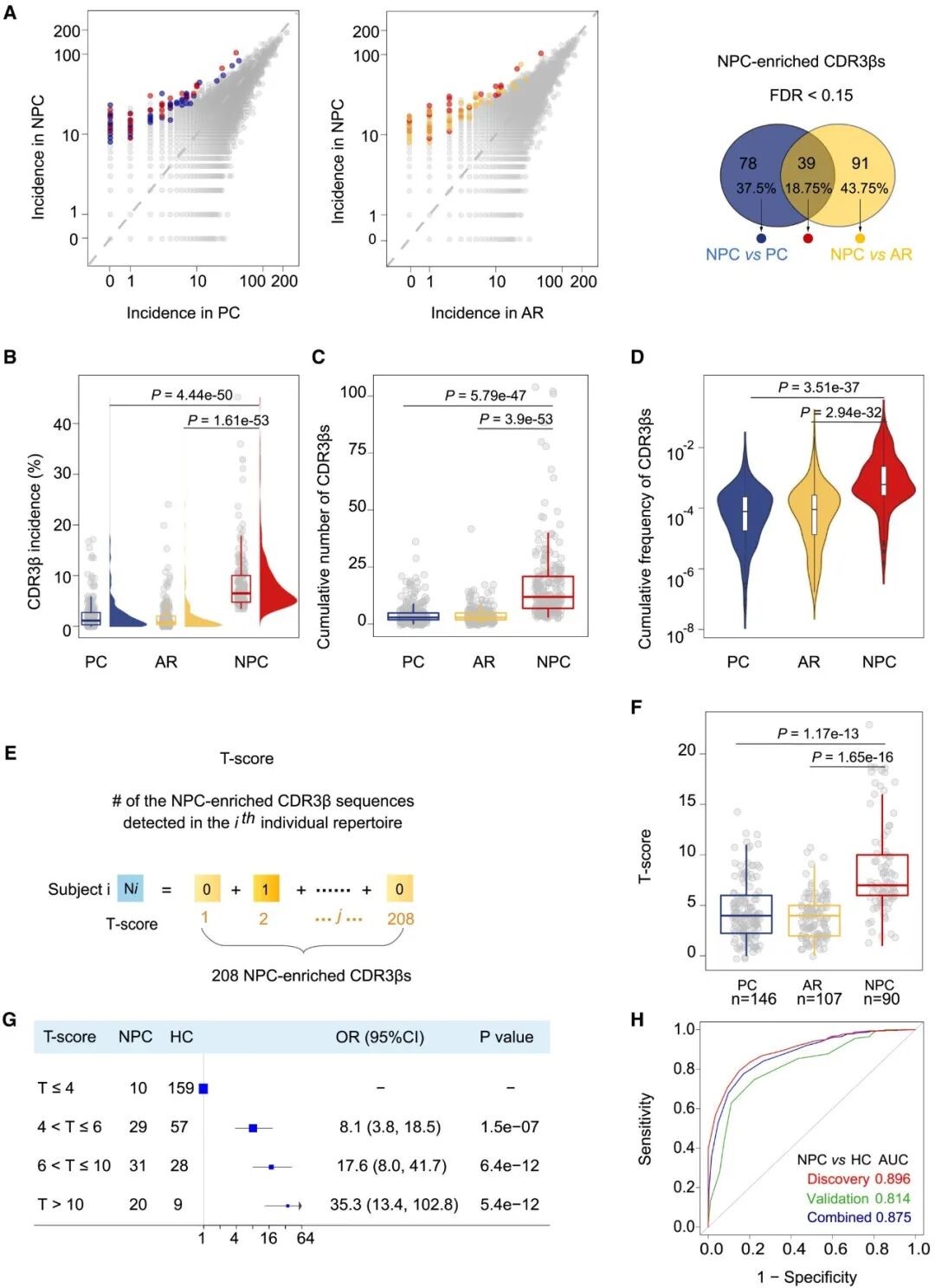 为了评估 NPC 富集型 TCRs 的诊断潜力,研究人员基于上述 208 条富集序列构建了 T-score 模型,用以衡量个体 TCR 免疫组库中 NPC 富集型 TCRs 的克隆型丰度 (图 2. E)。在发现队列中,NPC 患者的 T-score 均值 (8.46) 显著高于 PCs (4.43) 和 ARs (3.86) (图 2. F)。与 T-score ≤ 4 的人群相比,T-score > 10 的个体发生 NPC 的风险增加了 35 倍 (95% CI:13.36-102.81) (图 2. G)。T-score 模型在区分 NPC 患者与健康对照组中的表现优异 (AUC = 0.81;95% CI: 0.76-0.86) (图 2. H)。