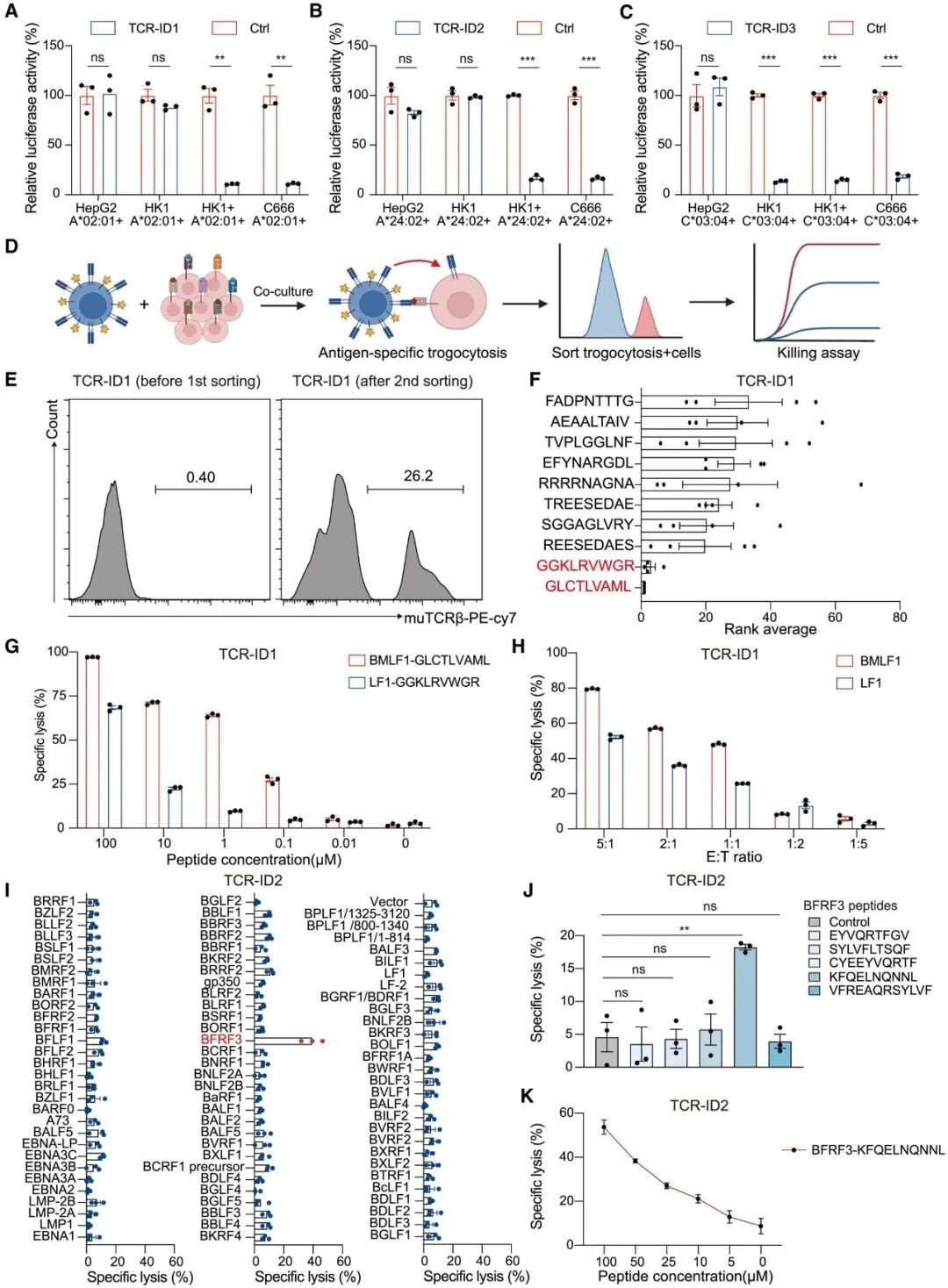 为了进一步验证 NPC 富集型 TCRs 的功能及其对 EBV 抗原的反应性,研究人员从 208 条 NPC 富集型 TCRs 序列筛选出三条具备完整 α/β 链信息、在血液及肿瘤中高频出现、并与特定 HLA 等位基因显著相关的 TCRs:TCR-ID1、ID2和ID3 (图 4. E)。其中,ID1 与 ID2 分别与 HLA-A*02:01 和 HLA-A*24:02 相关,且推测具有 EBV 反应性;ID3 则与 HLA-C*03:04 相关,但未显示 EBV 特异性 (图 5. A-C)。通过功能性研究验证,两条 TCR 特异性识别 EBV 蛋白 BMLF1/LF1/BFRF3 的全新抗原表位,其中一条更具备交叉识别能力,介导对 EBV 阳性肿瘤细胞的杀伤;另一条 TCR 则靶向非病毒来源的 NPC 相关肿瘤抗原,首次证实 NPC 中存在病毒与肿瘤抗原的双重免疫监视网络 (图 5. D-K)。