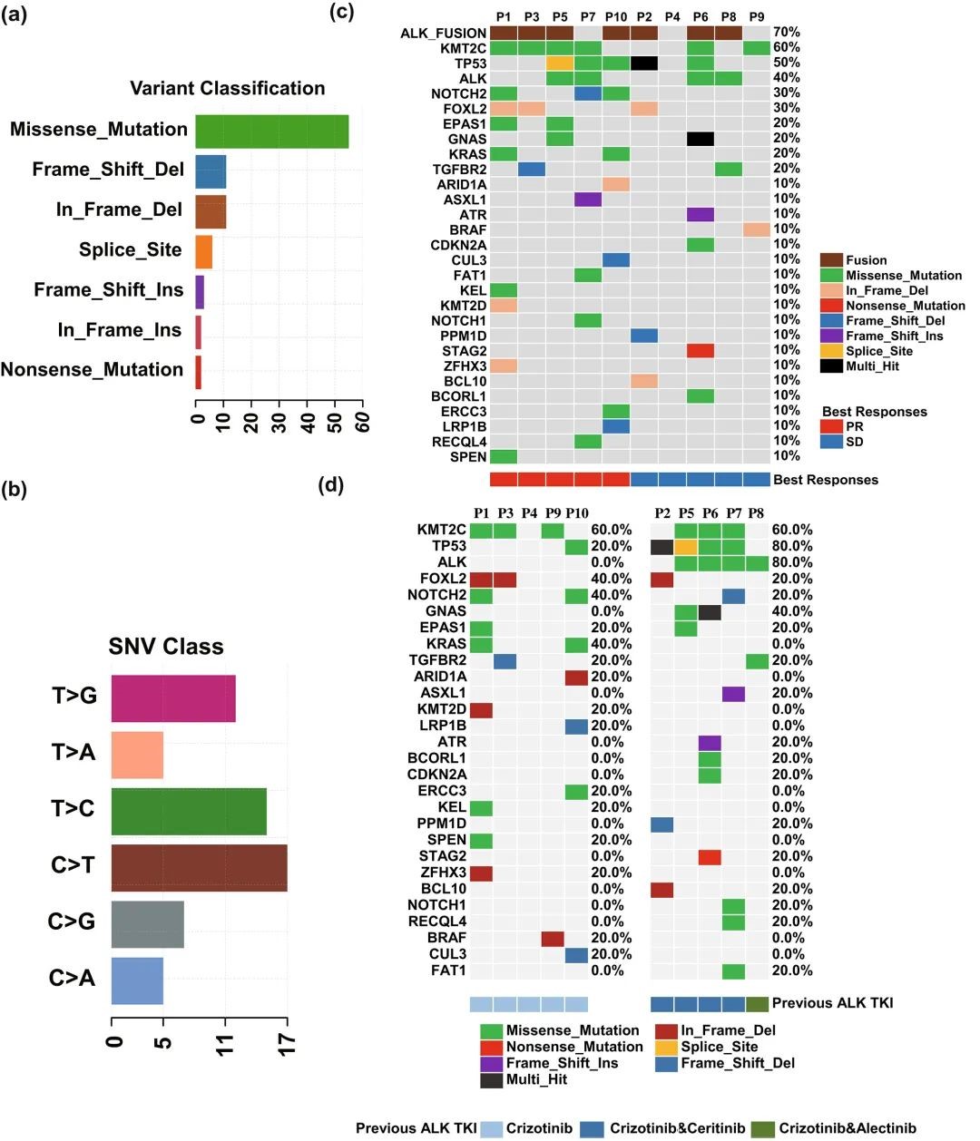 图 1. 10 例患者在洛拉替尼治疗前基线 ctDNA 的基因突变图谱和模式。 (a)-(b) 10 例样本的突变类型 (a) 和 SNV 类型 (b) ;(c) 10 例患者在洛拉替尼治疗前基线 ctDNA 的驱动基因突变情况;(d) 在既往使用不同 ALK-TKIs 治疗的患者中,基线 ctDNA 的基因突变情况。