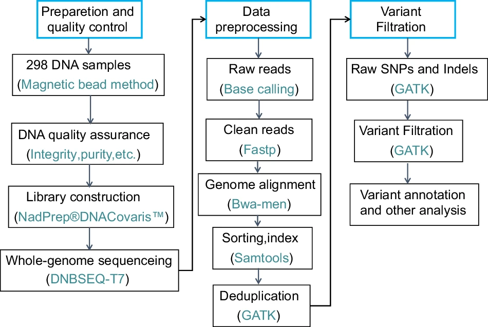 血液样本经标准化流程提取基因组 DNA 后进行超声片段化处理。随后,使用 NadPrep® SP Beads 进行片段筛选与纯化,并采用 NadPrep® DNA Library Prep Kit 完成预文库构建。最终在 DNBSEQ-T7 高通量测序平台上开展基因组测序。