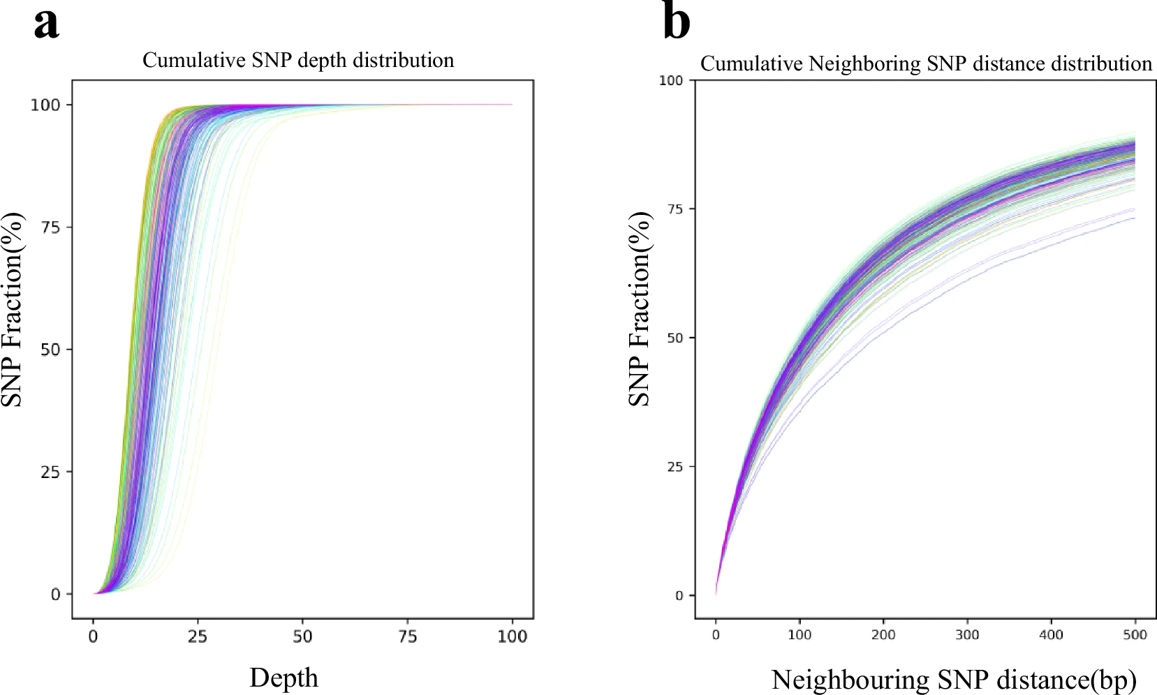 图 3. SNP 深度分布统计 (a) 及相邻 SNP间距分布统计 (b)。不同颜色代表不同个体样本。