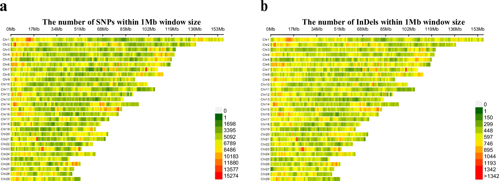 图 4. 298 头中国萨能奶山羊全基因组范围内 SNP 和 InDel 的分布情况。a. 全基因组范围内的 SNP密度统计,颜色梯度反映每 1 Mb 窗口内 SNP 数量的变化;b. 全基因组范围内的 SNP 和 InDel 密度统计。