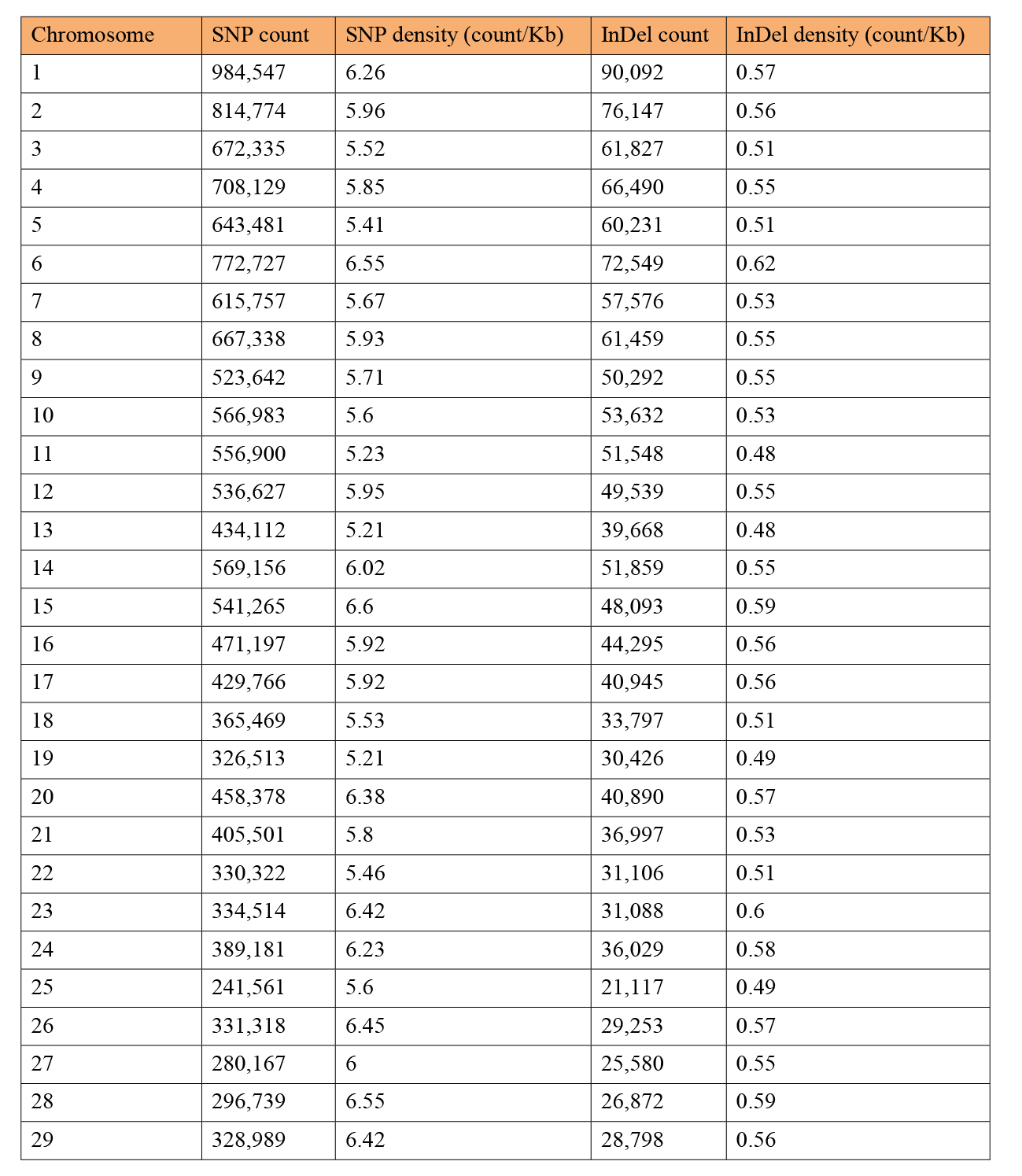 表 2. 各染色体中 SNP 和 InDel 的统计汇总。变异密度按每千碱基 (Kb) 长度内的突变数计算。